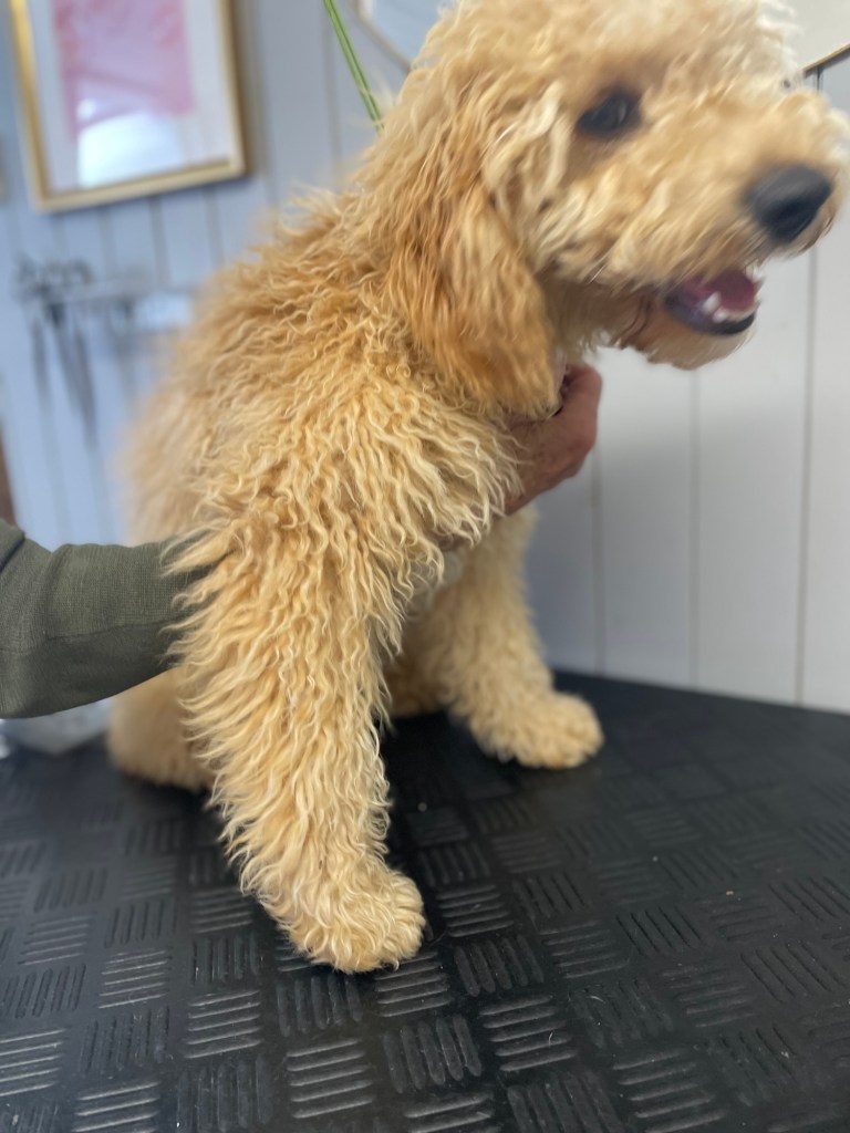 🐶 Maja var nylig innom for sin aller første klipp etter valpepakke. Hun er under 6 måneder, men allerede 10 kg med masse energi! En skikkelig gladjente som syns det var stas (i noen øyeblikk) å være i salongen – selv om det ble litt tungt arbeid med all hoppingen 🥰